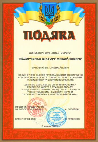 Директору ПКФ "Побутсервіс" від імені українського представництва міжнародної Асоціації карате та сумського фонду сприяння традиційному та спортивному карате