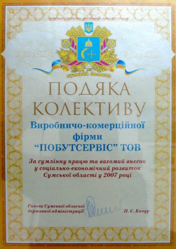 За сумлінну працю та вагомий внесок у соціально-економічний розвиток Сумської області у 2007 році